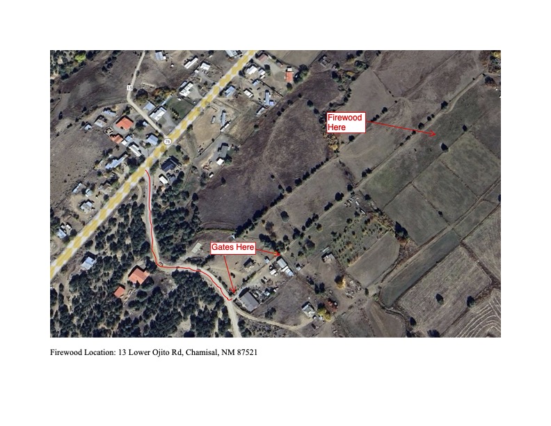 1. The firewood is located at 13 Lower Ojito Rd. in Chamisal, NM, which is private property. Click here for a map of the firewood location.